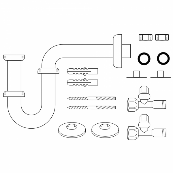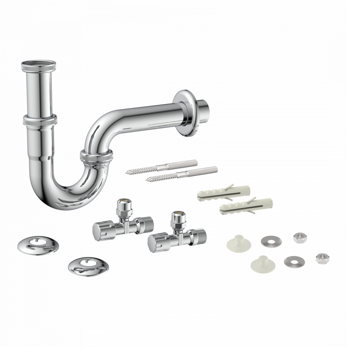 • Waschtisch-Röhrensiphon-Set, 1 1/4 x 32 mm, mit Befestigung, mit 2x Eckventil • Waschbecken Abfluss 1 ¼“ • 2x Eckventile • Vollständiges Montage-Set inkl. Wandrosette • Ausführliche Montageanleitung