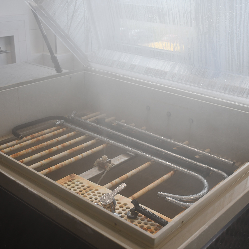 Schöne Oberflächen sollen auch lange schön bleiben. Mit Salzsprühnebeltests (NSS) simulieren wir Wochen und Monate voller Belastung durch Feuchtigkeit und Umwelteinflüsse. Nur Beschichtungen, die diesen Härtetest bestehen, kommen bei uns durch.